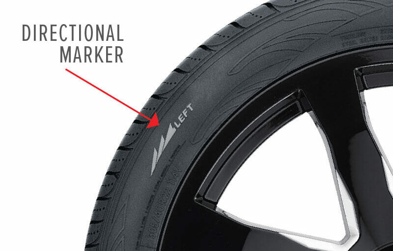 Directional tires are designed to rotate in a specific direction. The rotation direction is usually indicated on the sidewall of the tire. Most directional tires should be rotated front-to-back, but some may require cross-rotation.