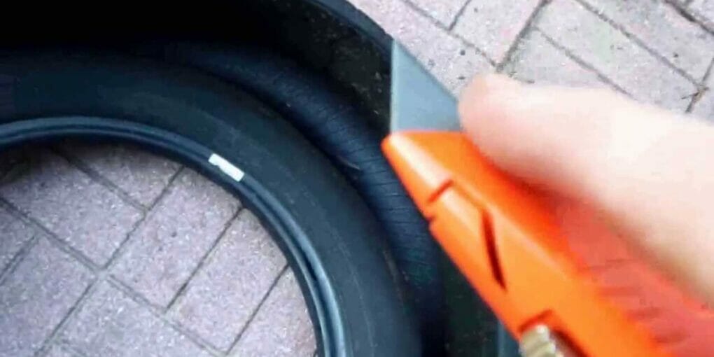 Start by making a shallow cut along the circumference of the tire. Then, increase the depth of the cut until you’ve reached halfway through the thickness of the tire. Finally, complete the cut by finishing up along the circumference of the tire.